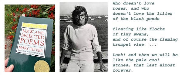 And there is poetry. Sam’s bookmark in Mary Oliver’s New and Selected Poems takes me to “Hummingbird Pauses at the Trumpet Vine”. My apologies to Oliver for abbreviating it, below.