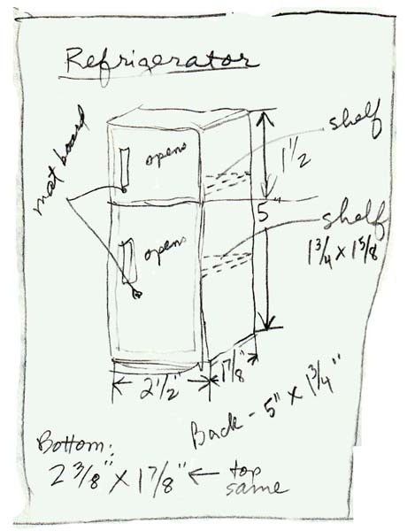 I used a standard dollhouse scale of 1/12, so that my 12-inch-square floor would equal a 12-foot-square room. Today, I took my “Dollhouse” manila folder out of the file drawer, and opened it. I see the refrigerator right at the top of my sketch for the kitchen.