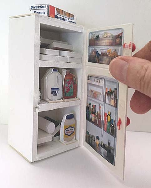 I used foam core board for the body and shelves of this refrigerator. (We called it an ice box when I had my own first dollhouse, because it was cooled by a chunk of ice, late 1940’s). The doors are white mat board as planned, but the handles turned out to be red beads. Hot-glued snips of Velcro hold the doors closed.