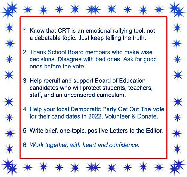 Thanks Deda. This is very good. Our Polk County School Board meets this Monday and I will attend to support them. They have made good decisions but our local politics have made their roles into a very uncomfortable place to be. I believe that many of the folks here in Polk County are being manipulated by powerful groups and individuals who use fear, lies, and "dog whistles" to rouse anger. CRT, socialism, anti-Christianism, government control are some of what they fear with no good reasons or understanding. So, thanks for this.